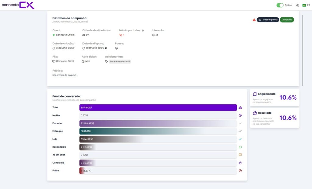 Acompanhe os dados em tempo real de cada campanha de disparo em massa criada.